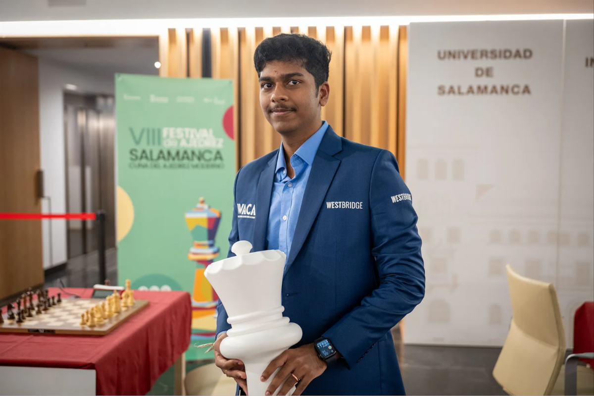 27.10.2025 – Die achte Ausgabe des Salamanca Masters brachte erneut Schnellschach der Spitzenklasse in die traditionsreiche spanische Universitätsstadt. Sechs Spielerinnen und Spieler aus fünf Ländern traten in einem doppelrundigen Turnier an. Jugendweltmeister Pranav Venkatesh dominierte mit einer beeindruckenden Leistung. | Fotos: Universität Salamanca - USAL