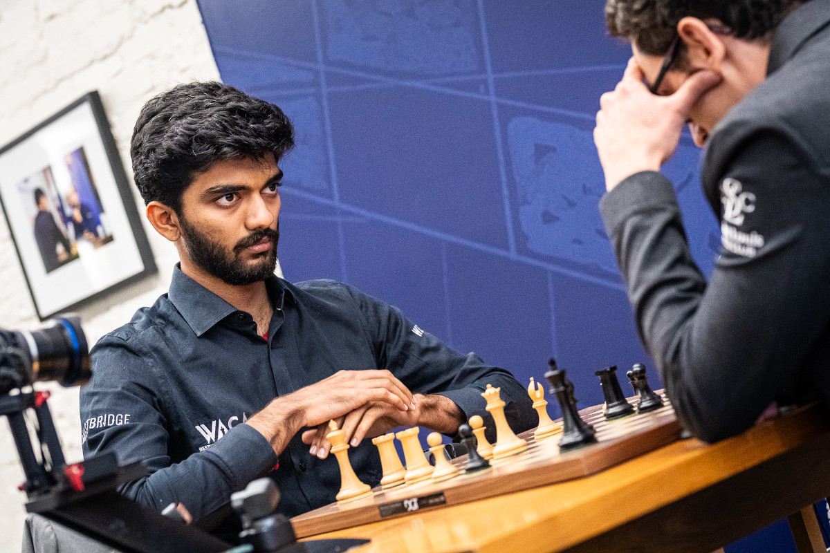 28.10.2025 – Der erste Tag des Clutch Chess Champions Showdown in Saint Louis endete mit einer kleinen Überraschung: Weltmeister Gukesh, nominell der schwächste der vier Teilnehmer, verlor seine Auftaktpartie gegen Magnus Carlsen, fand dann aber rasch zu seiner Form. In den folgenden fünf Partien erzielte er drei Siege und zwei Remis und übernahm mit 4 aus 6 Partien die alleinige Führung. Carlsen folgt mit 3,5 Punkten, während Hikaru Nakamura auf 3 Punkte kommt. Fabiano Caruana bildet mit 1,5 Punkten das Schlusslicht. | Foto: Lennart Ootes