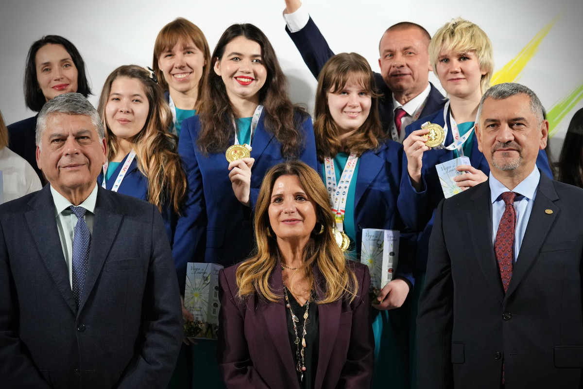 24.11.2025 – Als FIDE-Team gewann Russland die Goldmedaille bei der Mannschaftsweltmeisterschaft der Frauen in Linares und krönte damit eine Siegesserie, in der es sowohl die Gruppenphase als auch die K.o.-Runden ohne einen einzigen Tiebreak überstand. Aserbaidschan belegte nach einer beeindruckenden Leistung den zweiten Platz, während China sich durch einen Sieg über Kasachstan die Bronzemedaille sicherte. Polina Shuvalova lieferte eine herausragende Einzelleistung für die Weltmeisterinnen und erzielte am dritten Brett außergewöhnliche 9½/10 Punkte. | Foto: Pavel Dvorkovich