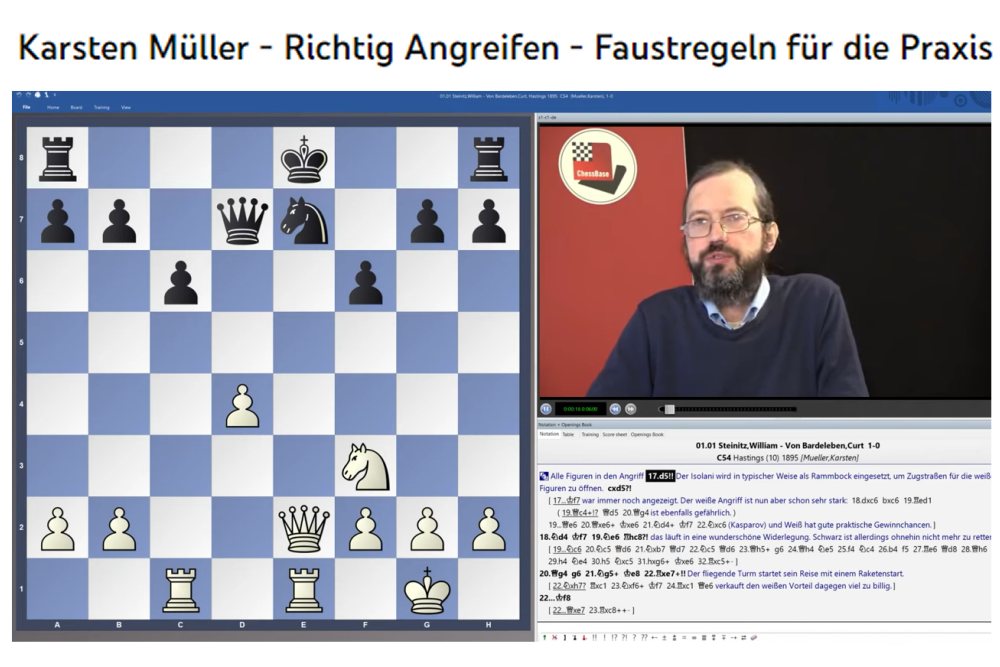 06.02.2023 – Angreifen ist das, was beim Schach am meisten Spaß macht. Im Idealfall setzt man matt! Aber wie gestaltet man seinen Angriff erfolgreich? Auf seinem neuesten Fritztrainer hat Großmeister Karsten Müller einige Faustregeln für einen erfolgreichen Angriff zusammengestellt. Christian Höthe hat sich den Kurs angesehen.
