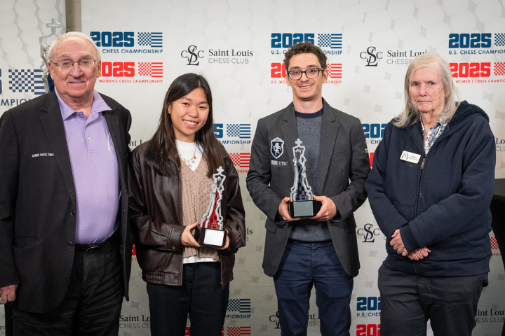 18.10.2025 – Nach Runde 5 der US-Meisterschaften am Freitag ist noch alles offen. Hans Niemann, Fabiano Caruana und Wesley So führen mit 3,5 aus 5 die Tabelle im offenen Turnier an. Durch ihren Sieg gegen Nazi Paikidze führt Alice Lee nun bei der US-Frauenmeisterschaft mit 3,5 Punkten und teilt sich die Spitze mit Anna Sargsyan, die gegen die nominell stärkste Spielerin des Turniers, Carissa Yip, verlor. | Foto: Lennart Ootes, Saint Louis Chess Club