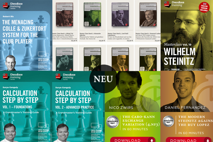 23.11.2025 – Was braucht man mehr? Die Oktober-Neuheiten von ChessBase decken die Bereiche Schachgeschichte, Eröffnungsrepertoire und Rechentraining ab: Das bewährte Master Class-Expertenteam um Dorian Rogozenco, Karsten Müller, Mihail Marian und Oliver Reeh stellt in Folge 19 den ersten Weltmeister Wilhelm Steinitz vor. Auf diese lange zurückliegende Zeit geht letztlich auch der Eröffnungskurs von Robert Ris zurück. Denn der Name der von ihm intensiv analysierten Eröffnung geht ebenfalls auf zwei Altmeister des Schachs zurück: das Colle & Zukertort System. Und wer blickt nicht gerne in die Denkprozesse von Großmeistern und Weltklassetrainern? Lernen Sie Rechenprozesse auf Topniveau kennen – Surya Gangulys „Calculation Step by Step“ wird sicher schnell in die ChessBase-Bestsellerliste vorstoßen. | Alle Fotos: ChessBase