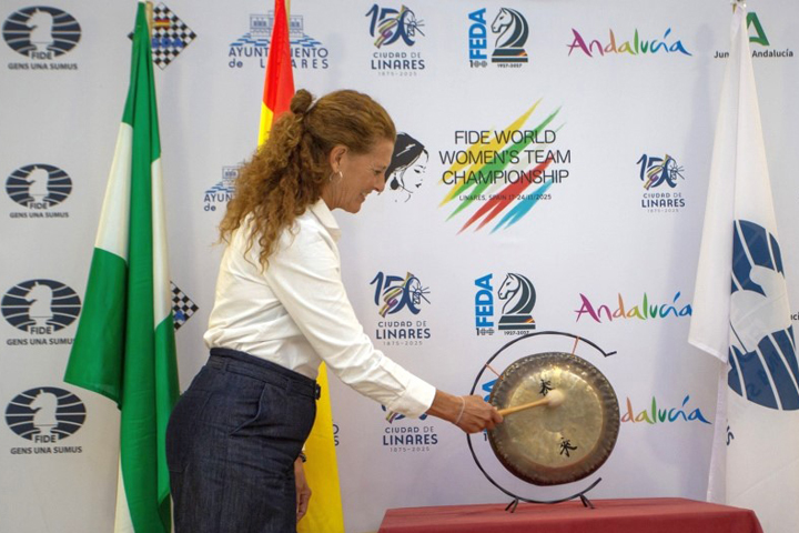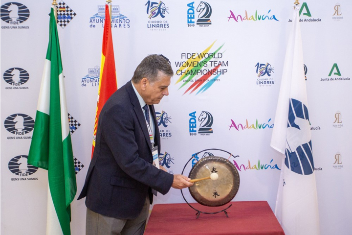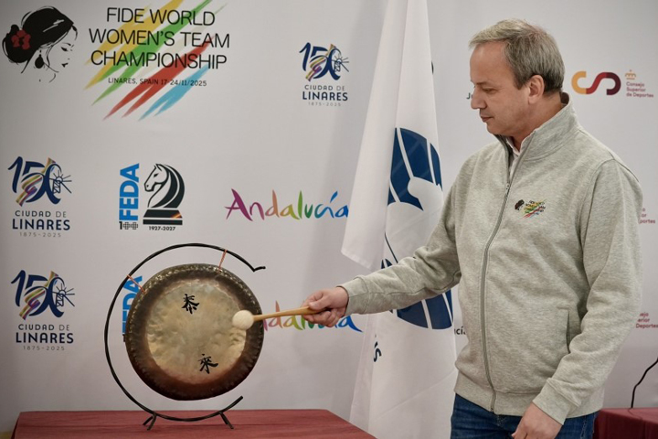 19.11.2025 – Mit dem feierlichen Gongschlag, einer Hommage an die legendäre Super-Turniertradition von Linares, eröffneten FIDE-Präsident Arkady Dvorkovich und FIDE-Vizepräsident sowie Ex-Weltmeister Viswanathan Anand die ersten beiden Runden der FIDE Women’s World Team Championship 2025. Das Turnier, das in zwei Pools mit jeweils sechs Teams im Round-Robin-Modus gestartet wurde, begann direkt mit Spannung: Neben deutlichen Favoritensiegen prägten bemerkenswerte taktische Glanzleistungen und ein überraschender Underdog-Erfolg den Auftakt der Veranstaltung – erstmals ausgetragen im neuen „fast classical“-Format 45’ + 30”. | Fotos: FIDE/Raul Martinez, Pavel Dvorkovich