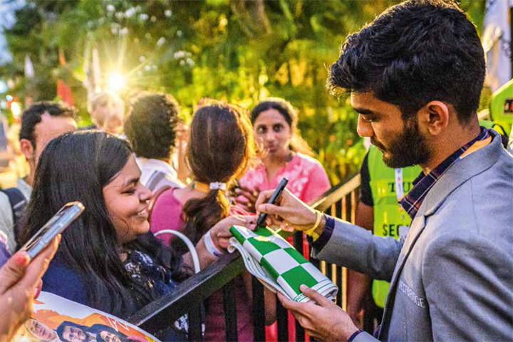 28.11.2025 – Der World Cup 2025 in Indien ist ein Schachfest für Spieler wie Zuschauer. Unter den 206 Teilnehmern befanden sich zu Turnierbeginn gleich 24 indische Spieler und die Resonanz in allen Medien – analog wie digital – war überwältigend. Von fast überall auf der Welt konnte man über die Social-Media-Kanäle das Treiben vor und im Spielsaal verfolgen und die Begeisterung der Menschen spüren. Gukesh Dommaraju erfüllte freundlich und geduldig die Autogrammwünsche der Fans. | Foto: Michal Walusza / FIDE