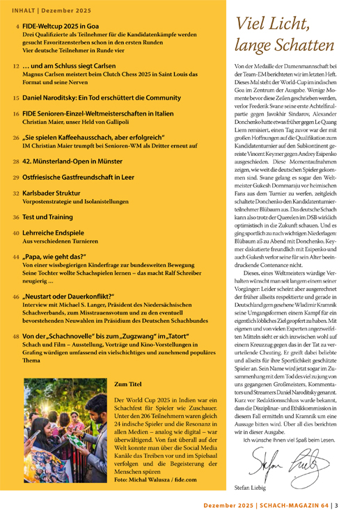 Das gerade erschienene Dezember-Heft des Schach-Magazin 64 hat aber neben der ausführlichen Weltcup-Analyse noch viel mehr zu bieten: