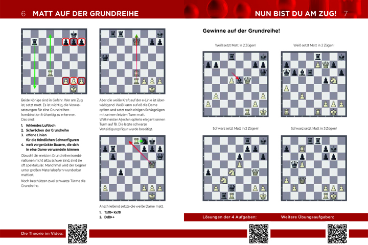 In diesem Hardcover-Buch erhalten Sie einen Überblick über die wichtigsten Matt-Motive und testen sich mit ersten Beispielaufgaben. Mit dem eingedruckten QR-Code setzen Sie den Kurs fort auf Ihrem Tablet/ iPad oder Smartphone Mattangriffe sind der Höhepunkt jeder Schachpartie – der Moment, in dem Strategie auf Schönheit trifft. Doch ein erfolgreicher Mattangriff erfordert mehr als nur Kreativität: Es braucht ein Arsenal an einstudierten Mustern, die Sie erkennen, anwenden und variieren können.