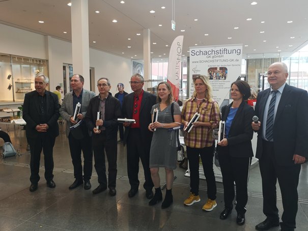 Die deutschen Meisterinnen und Meister: in der 2. Reihe von rechts: Dr. Gerhard Köhler, Organisator und Präsident Kinderschach in Deutschland e. V.; daneben Paul Werner Wagner, Moderator Podiumsdiskussion | Foto: Maike Glöckner.