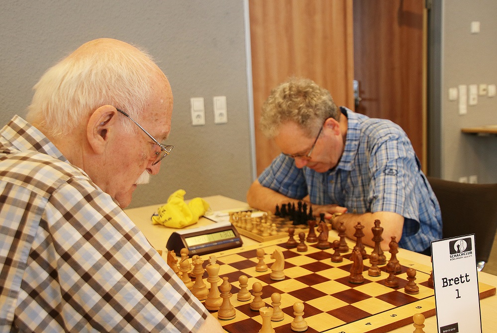 Der Spitzenspieler des Bilndenschachbunds, Olaf Dobierzin (rechts) schlägt sich mit zwei Zählern nach vier Runden ausgezeichnet