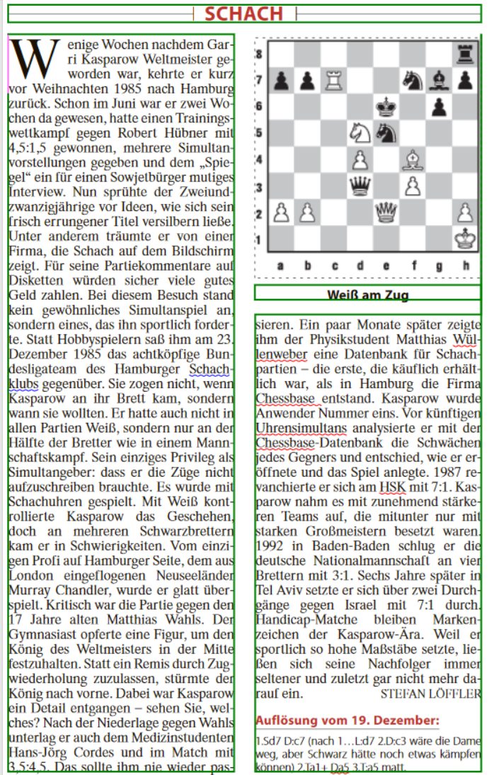 Stefan Löffler erinnerte in seiner Schachkolumne am 23. Dezember 2025 in der Frankfurter Allgemeinen Zeitung an einen, eigentlich zwei Besuche von Garry Kasparov in Hamburg.