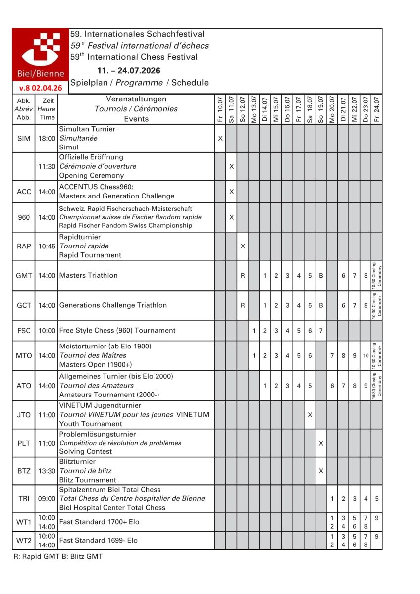 Spitalzentrum Biel Total Chess – Triathlon (TRI): jeden Morgen der letzten Woche ein Match aus einer Rapidpartie (10’+5’’) + einer Blitzpartier (3’+2’’) + einer Fast-Standard-Partie (60’+30’’). Perfekt für die, die Sommernachmittage in der Sonne geniessen möchten, oder die ATO oder MTO spielen.