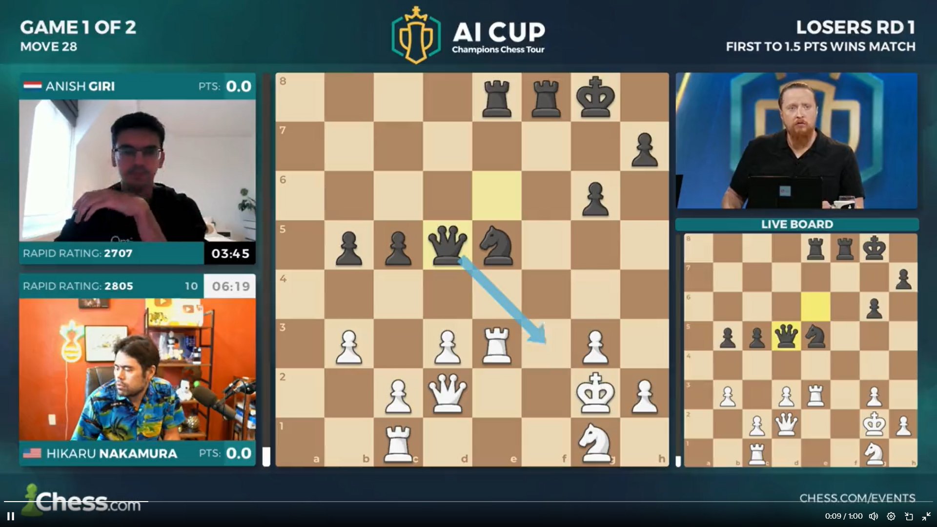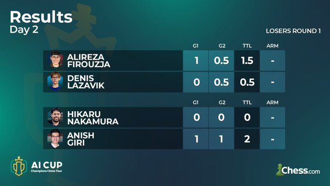 In der Verlierergruppe kam Anish Giri zu einem glatten 2:0 gegen Hikaru Nakamura. Hier werden die Matches nur noch mit "Best of 2" gespielt.
