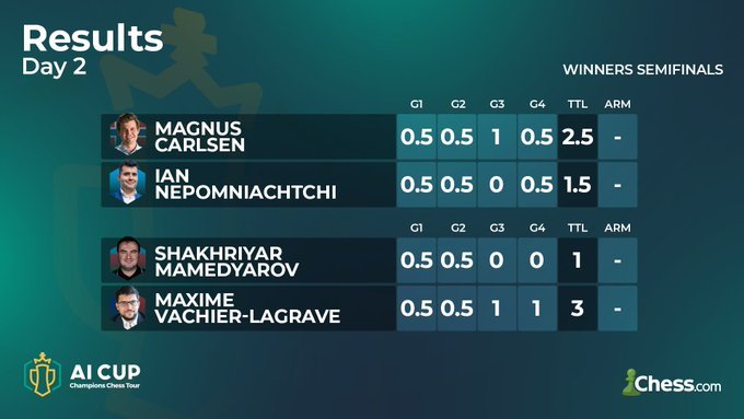 In Nepomniachtchi gewann am Dienstag Nachmittag die Levitov Chess Week in Amsterdam und hatte dann am frühen Abend auch noch das Vergnügen, gegen Magnus Carlsen online beim AI Cup in der Champions Chess Tour antreten zu dürfen. Der Sieger des Matches wäre für das Finale der Siegergruppe qualifiziert, auf das aber im Format des Doppel-K.o-Turniers auch noch das große Finale gegen den Sieger der Verlierergruppe folgt.