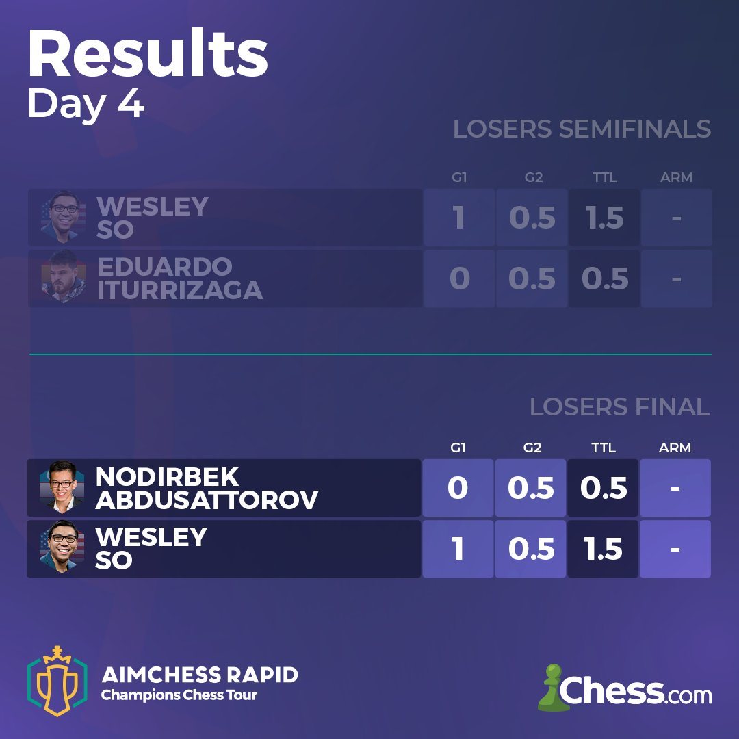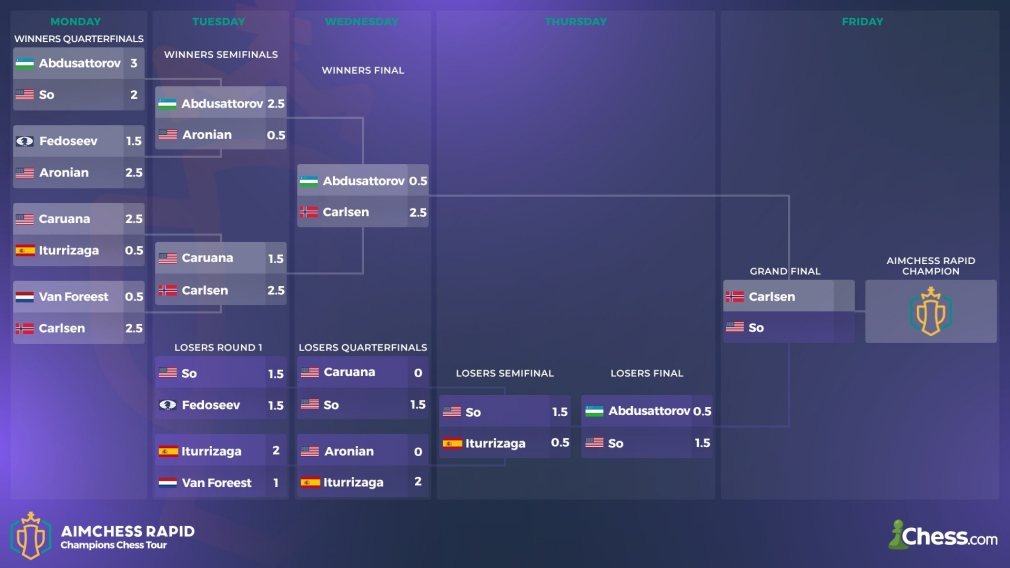 Das Aimchess Rapid ist Carlsens viertes Turnier in kurzer Folge, nach dem Norway Chess Turnier, der Global Chess League und dem Rapid and Blitz Croatia das erste Online-Turnier. Carlsen hat sich warm gespielt und ist zu großer Form aufgelaufen. Am Donnerstag hatte er Pause und konnte zusehen, wer sich bei den Kämpfen in der Verlierergruppe durchsetzen würde, um mit ihm am Freitag das Große Finale zu spielen. Es war Wesley So.