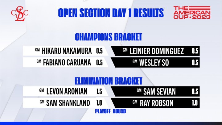 Im Elimination Bracket gewann Aronian 1,5-0,5 gegen Sam Sevian und Shankland besiegte Ray Robson nach dramatischem Matchverlauf mit 3,5-2,5. Damit sind Sevian und Robson ausgeschieden, Aronian und Shankland können sich noch Hoffnungen auf den Turniersieg machen.