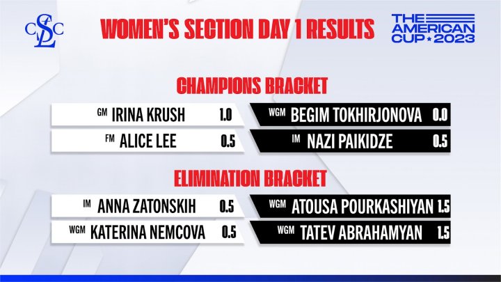 Das Frauenturnier des American Cup wird im gleichen Modus wie das Offene Turnier ausgetragen. Die dominierende Spielerin ist Frauenturnier ist bislang Irina Krush - sie gewann alle ihre drei bisherigen Partien und liegt so im Halbfinale des Champion Brackets mit 1-0 gegen Begim Tokhirjonova in Führung.