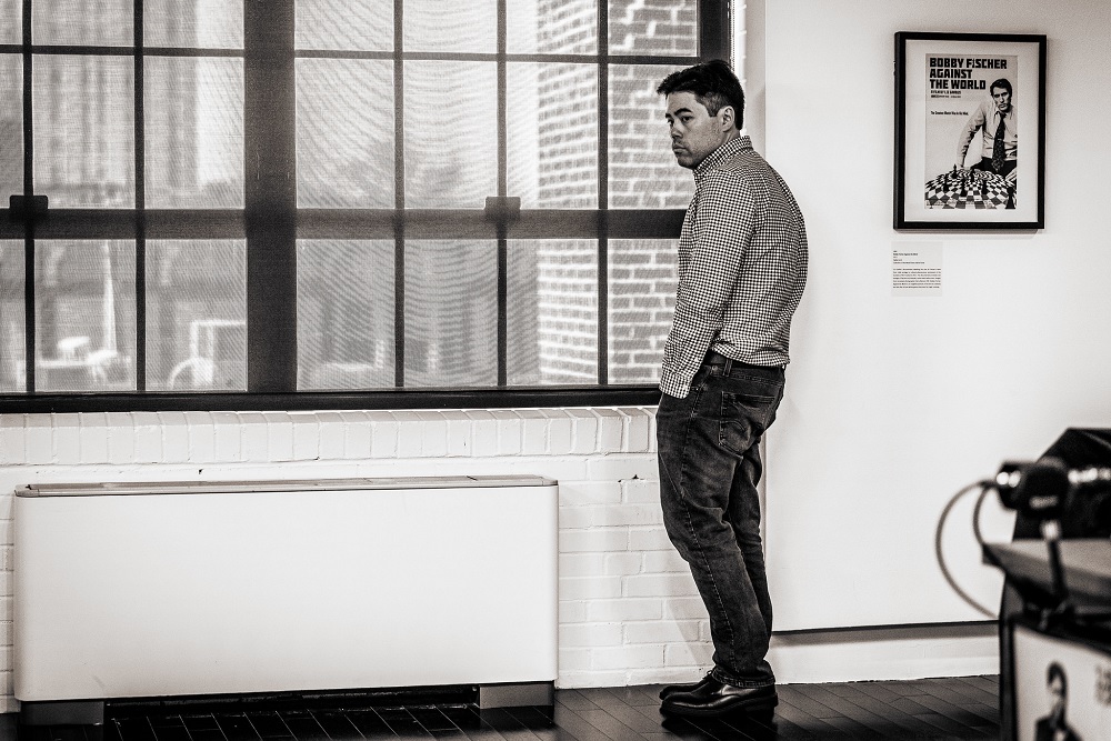 Hikaru Nakamura vor der Skyline von Saint Louis - und vor dem Konterfei eines berühmten "Urahnen"