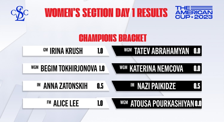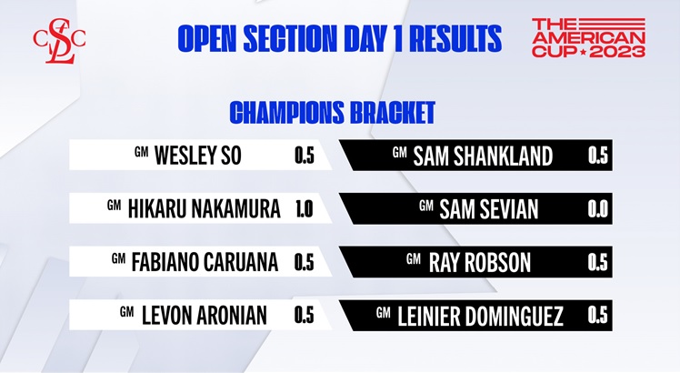 18.03.2023 – Der "American Cup" in Saint Louis hat am Freitag mit den Viertelfinals begonnen. Es wurden jeweils die ersten Partien gespielt; am Samstag (19.30 Uhr) folgen die Rückspiele. Im "Open" gab es neben dem Sieg von Hikaru Nakamura gegen Sam Sevian zunächst drei Remisen, und zwar zwischen Wesley So und Sam Shankland, zwischen Fabiano Caruana und Ray Robson sowie bei Levon Aronian und Leinier Dominguez. - Im parallel laufenden Frauenturnier sind Irina Krush, Begim Tokhirjonova und Alice Lee mit Siegen gestartet. | Fotos: Lennart Ootes / Saint Louis Chess Club
