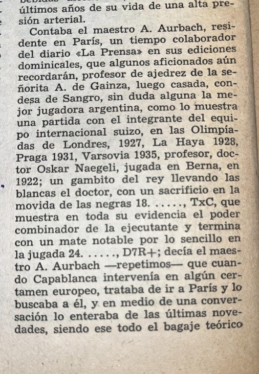 Der Absatz aus dem Anhang 37 der Zeitschrift Ajedrez aus dem Jahr 1978, S. 14. „Zweifellos die beste argentinische Spielerin”, sagt Monasterio, „wie eine Partie mit ... Dr. Oskar Naegeli in Bern 1922 zeigt, ... mit einem Opfer im 18. Zug ... , das die Kombinationsstärke von Angélica deutlich macht.“