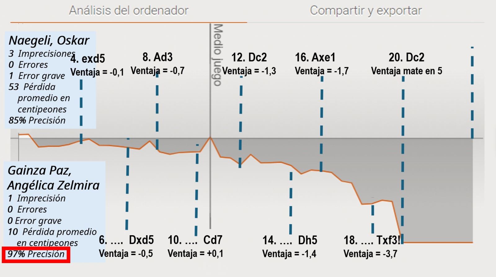 Wir nutzten die aktuelle elektronische Technologie und analysierten die Partie mit einer Schachengine. Es zeigte sich, dass Angélica dieses Spiel mit einer Genauigkeit von 97 % spielte. Eine absolut überlegene und erstaunliche Leistung.