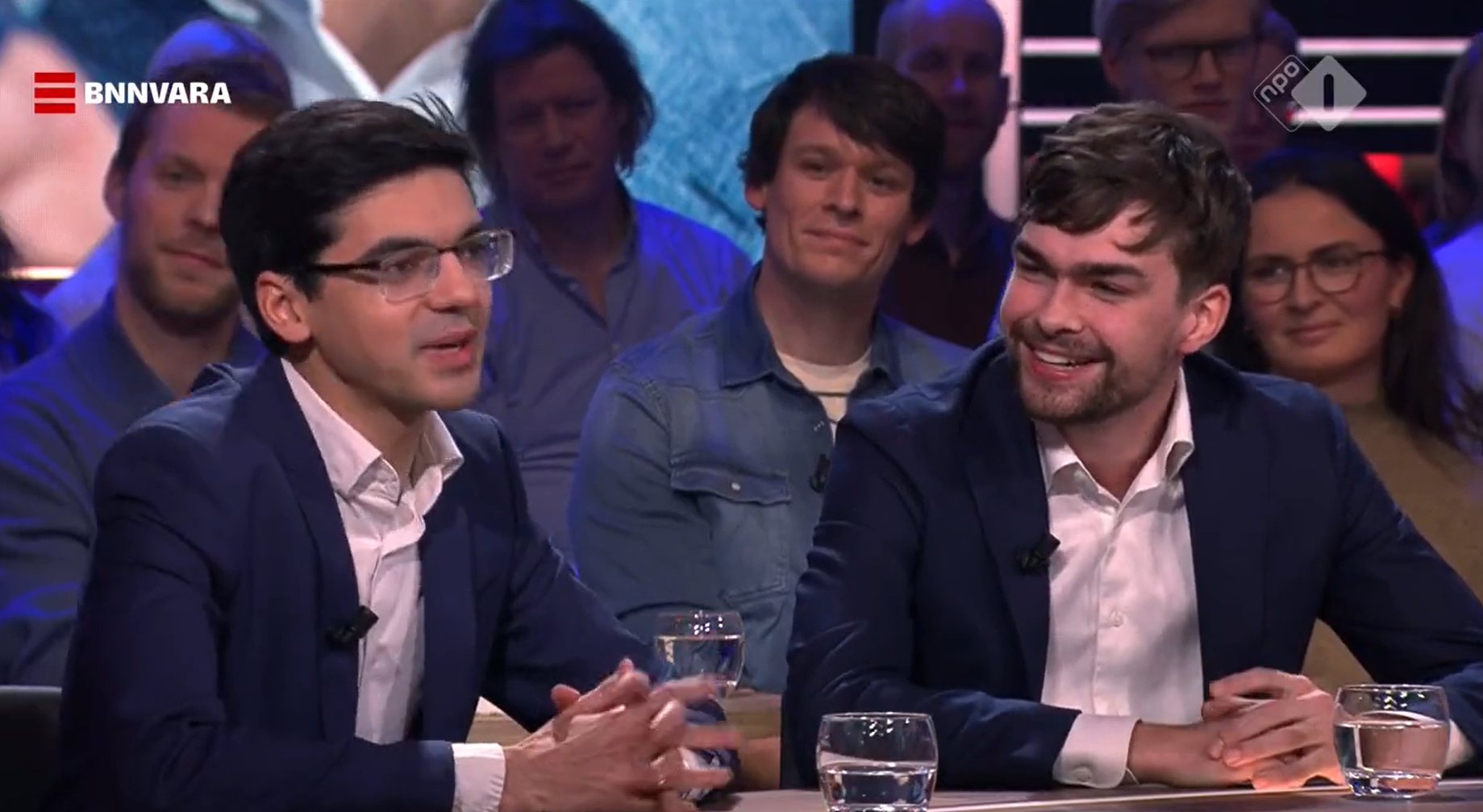 Die Moderatoren der Talkshow sind Sophie Hilbrand und Khalid Kasem. Am Dienstag waren dort die beiden niederländischen Schachprofis Anish Giri und Jorden van Foreest zu Gast. Beide haben sich inzwischen in die Siegerliste des Tata Steel Chess Turniers eintragen können, dem Aushängeschild des niederländischen Turnierschachs. Jorden van Foreest gewann das Turnier vor zwei Jahren und in diesem Jahr konnte Anish Giri erstmals das Turnier gewinnen. Die niederländische Nummer Eins besiegte im Verlauf des Turniers Weltmeister Magnus Carlsen und überholte in einem packenden Endspurt noch den lange führenden Nodirbek Abdusattorov (Usbekistan).