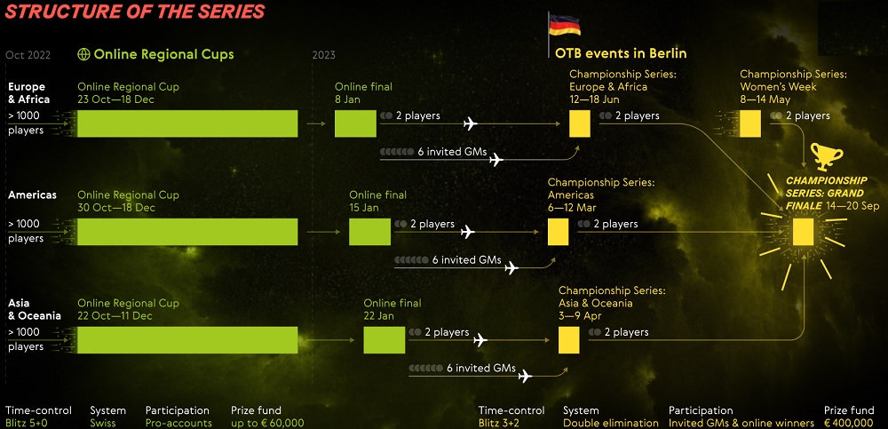 Die Serie von Blitzturnieren des Veranstalters "World Chess" befindet sich in der zweiten Phase, in der nicht mehr online, sondern vor Ort in Berlin gespielt wird. Drei Turniere mit jeweils acht Teilnehmern sind nach Erdteilen gegliedert. Hinzu kommt noch ein Frauenturnier und anschließend das "Grand Final" im September.