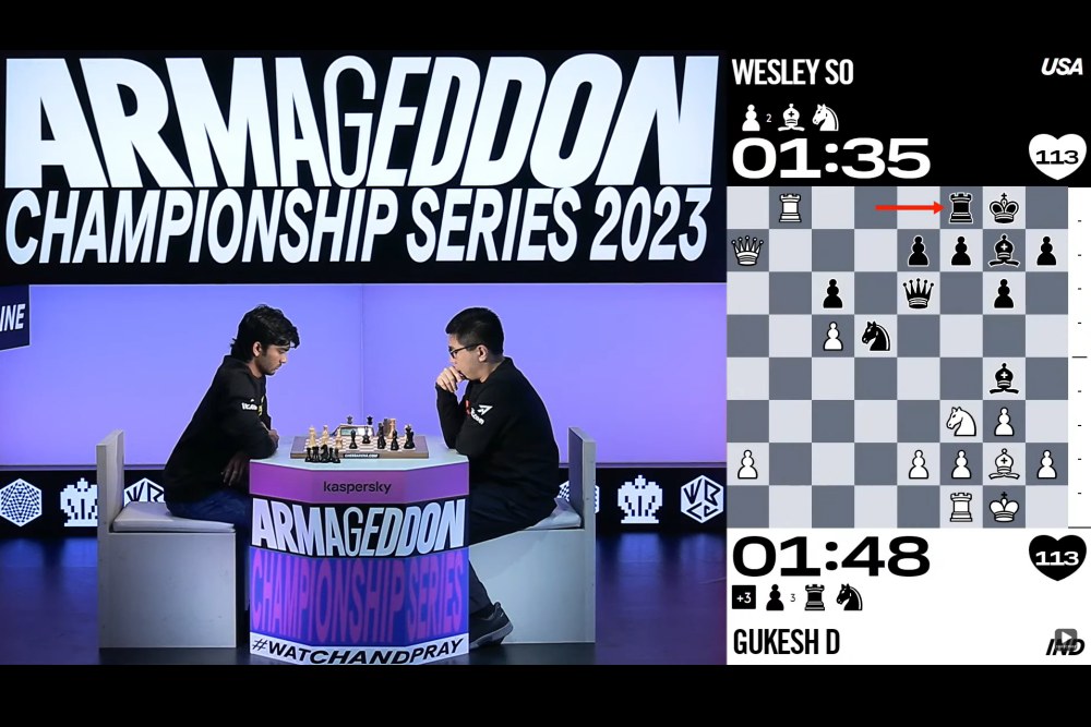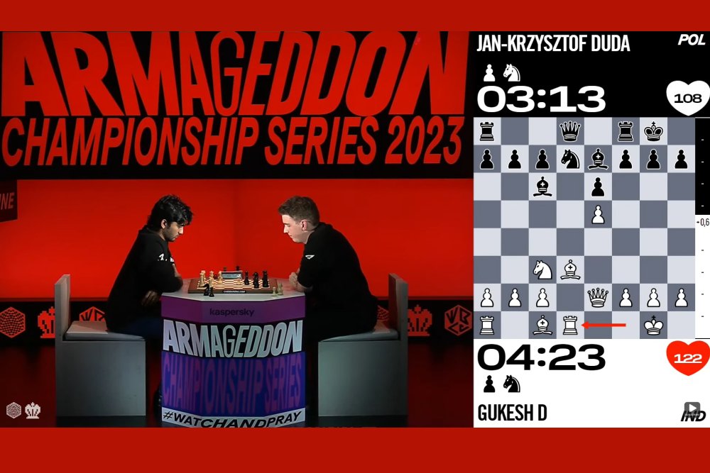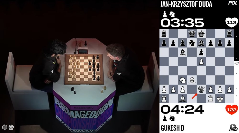 Gukesh gelang in der zweiten Partie der Ausgleich, so dass eine Entscheidungspartie im Armageddonmodus notwendig wurde. Jan-Krzystof Duda führte in dieser Partie die schwarzen Steine und hatte eine Minute weniger auf der Uhr. Gemäß den Regeln benötigte er nur ein Remis, um die nächste Runde zu erreichen. Gukesh musste zum Weiterkommen gewinnen. Die Partie verlief lange ausgeglichen, ohne dass Gukesh jedoch die notwendigen Gewinnchancn erhielt. Schließlich kippte die Partie zugunsten von Duda und Gukesh gab eine hoffnungslose Stellung auf.