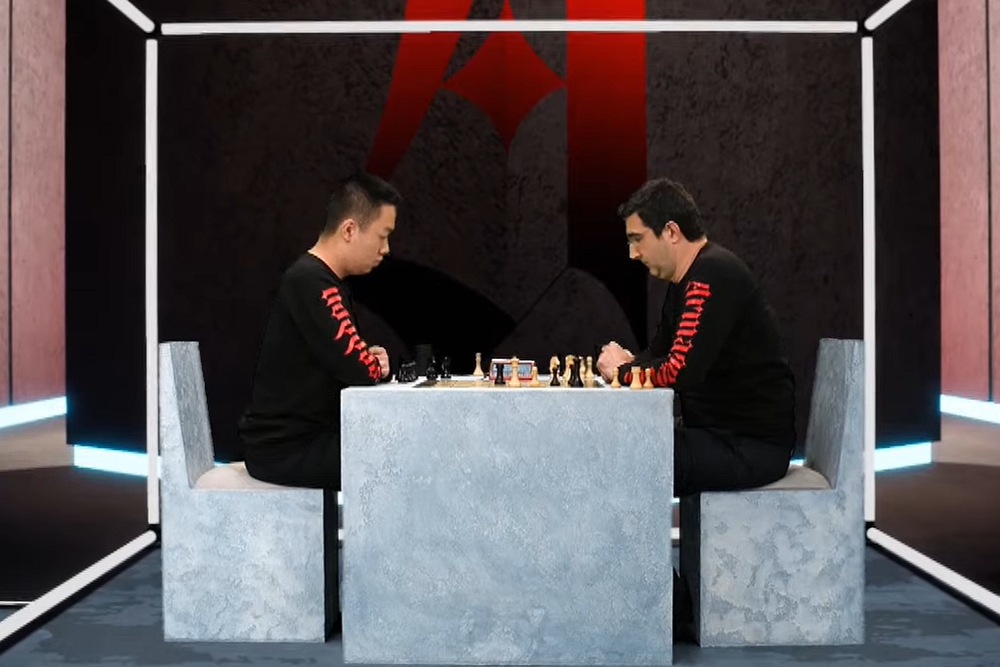 Zweiter Tag im neuen TV-gerechten Armageddon-Turnier vom Worldchess. Die Supergroßmeister stecken in schwarzen T-Shirts mit einer roten Frakturaufschrift "Armageddon" auf dem Ärmel und befinden sich in virtueller Realität. Wahrscheinlich sind alle Elemente in diesem Fernsehstudio grün oder blau überzogen, um für den TV-Zuschauer per Bluescreentechnik ein Bild zu erzeugen, dass es so in Wirklichkeit gar nicht gibt.