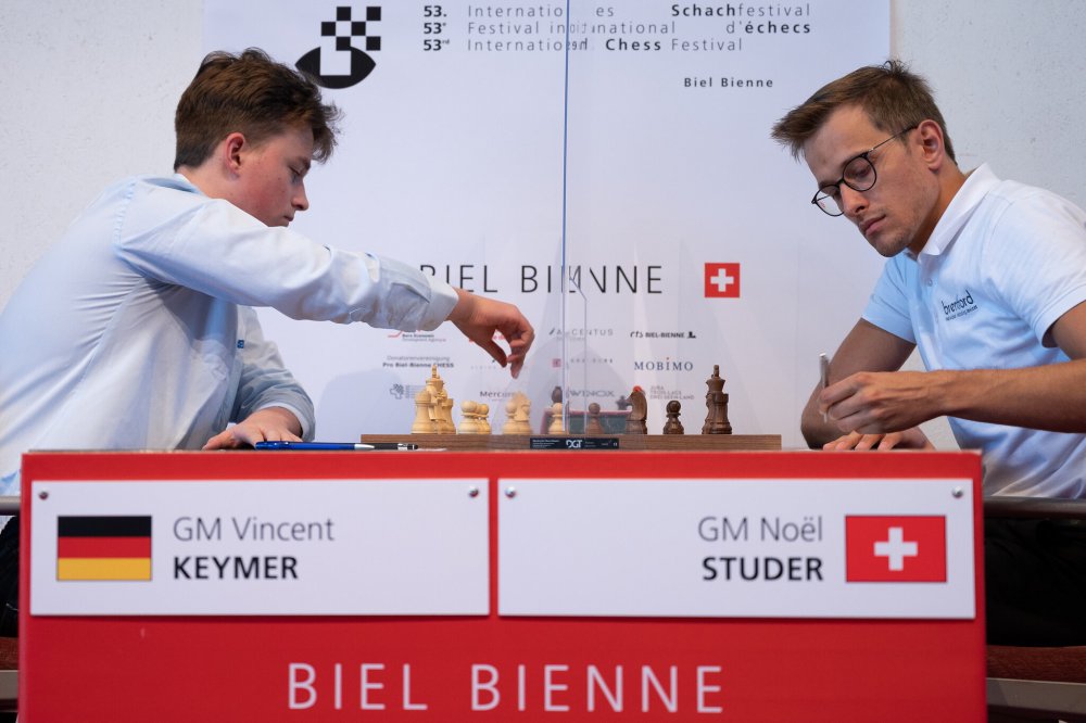Vincent Keymer spielte die scharfe 4.f3-Variante gegen den Nimzo-Inder des Schweizers Noel Studer und zeigte sich bestens präpariert. Bis zum 17.Zug schleuderte der junge Deutsche die Züge in sekundenschnelle aufs Brett. Studer musste die Qualität geben und suchte nach Gegenspiel mit einem starken Läufer. Keymer konnte aber auch nach dem Materialgewinn mit präzisen Zügen aufwarten und die Stellung im Angriffssinne weiter verschärfen. Mit taktischen Scharmützeln beendete er die Parte und steht nun wieder auf Tuchfühlung zur Spitze. Im klassischen Schach steht er bei starken 3 Punkten aus 5 Partien.