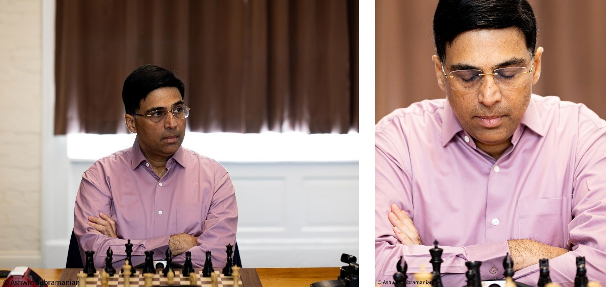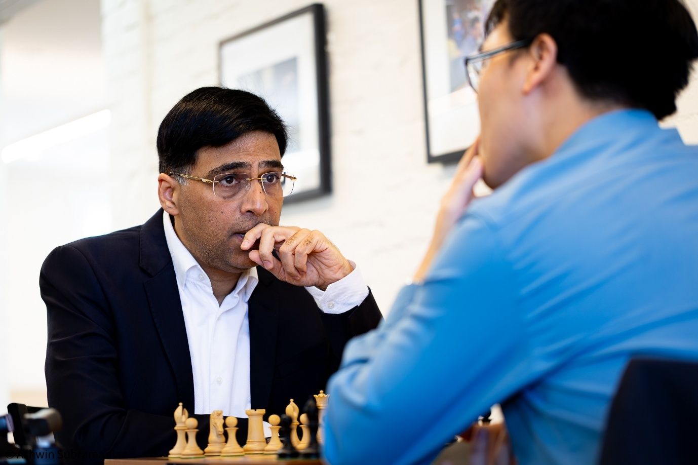 Die Konzentration ist spürbar. Vishy Anand ist in tiefes Nachdenken versunken, während er mit Lê Quang Liêm die Stellung des ersten Tages analysiert.
