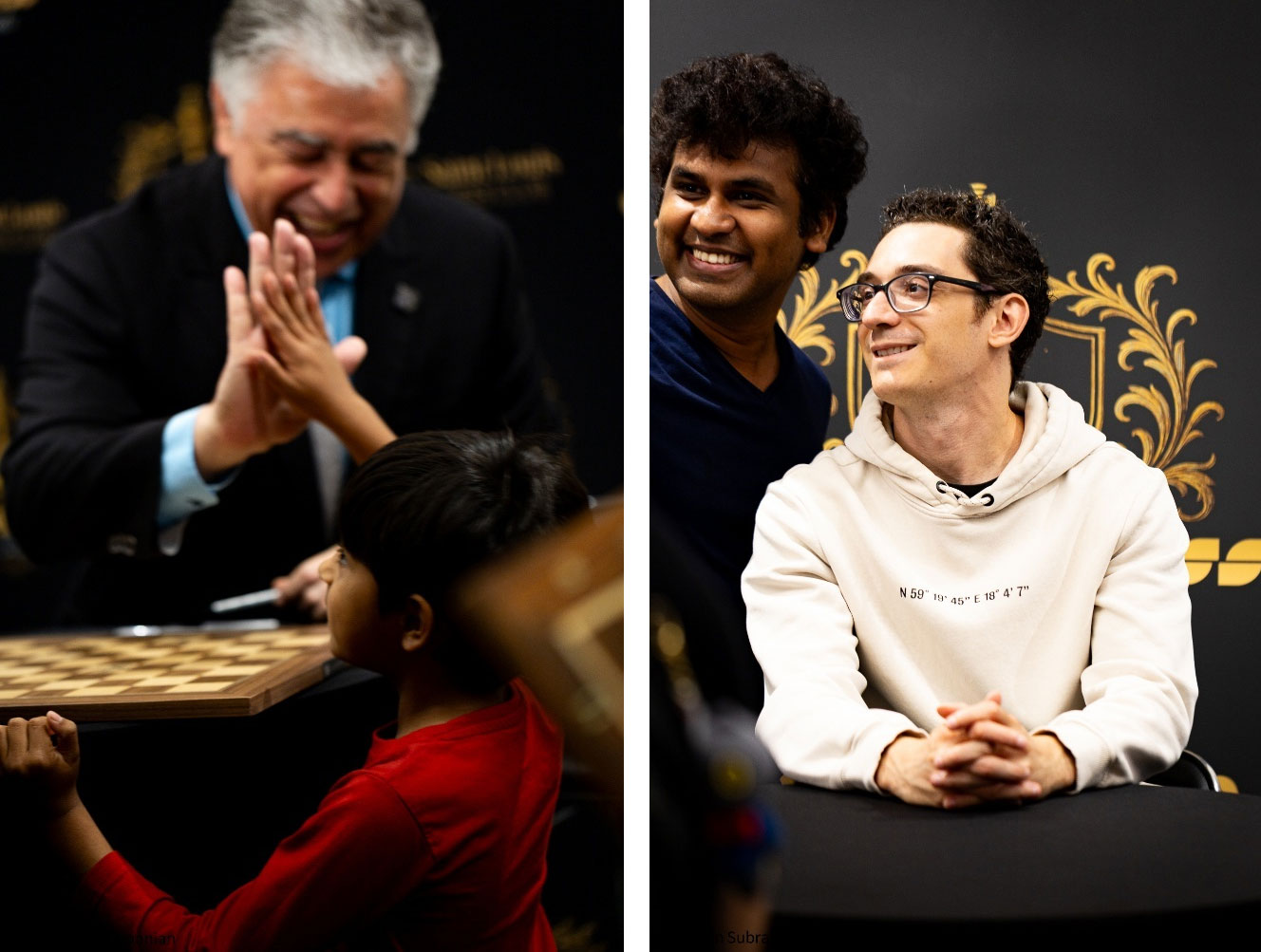Ein junger Fan bekommt ein unvergessliches High-Five von Schachlegende Yasser Seirawan. Genau das macht die Atmosphäre in St. Louis aus! Für die Fans begann das Match schon einen Tag früher – mit Fotos mit St. Louis-Schachikonen wie Fabiano Caruana und Autogrammen, die aus Souvenirs wertvolle Erinnerungsstücke machen!