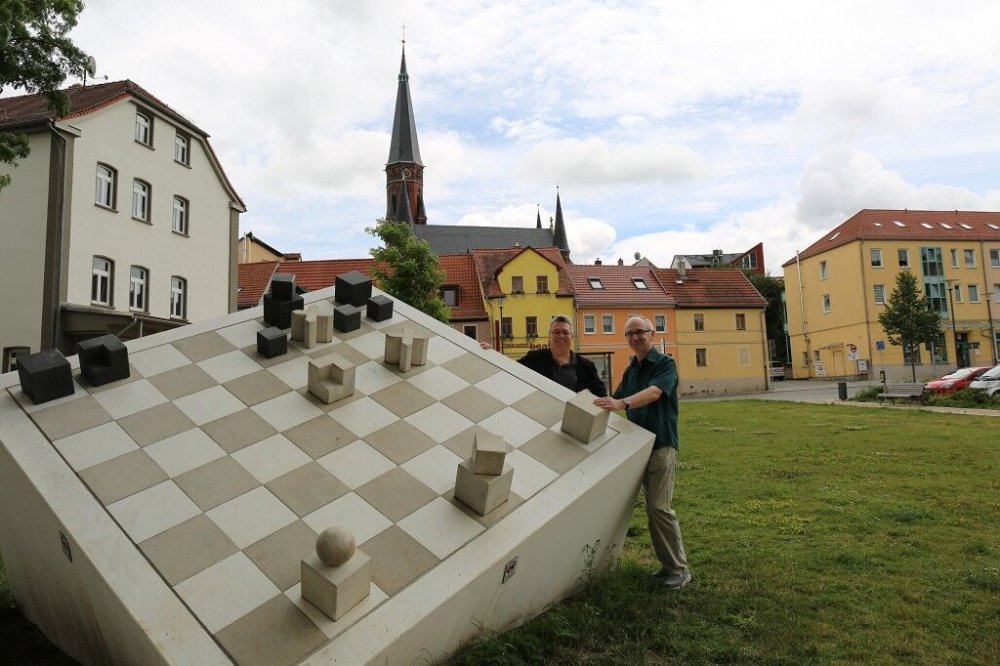Das Denkmal für das Bauhaus-Schachspiel wurde 2009 in Apolda geschaffen, stand ursprünglich an anderer Stelle und und fand dann seinen heutigen Platz vor der Stadthalle.