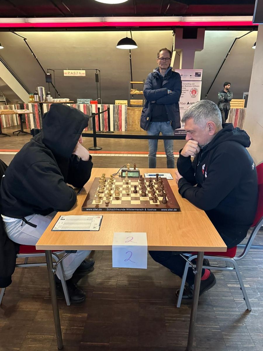 In Cognito? Elham Amar (l.) wurde erkannt und gewann sehenswert gegen Victor Bologan. Das war die erste entschiedene Partie des siebten Spieltags. | Foto: FC St. Pauli