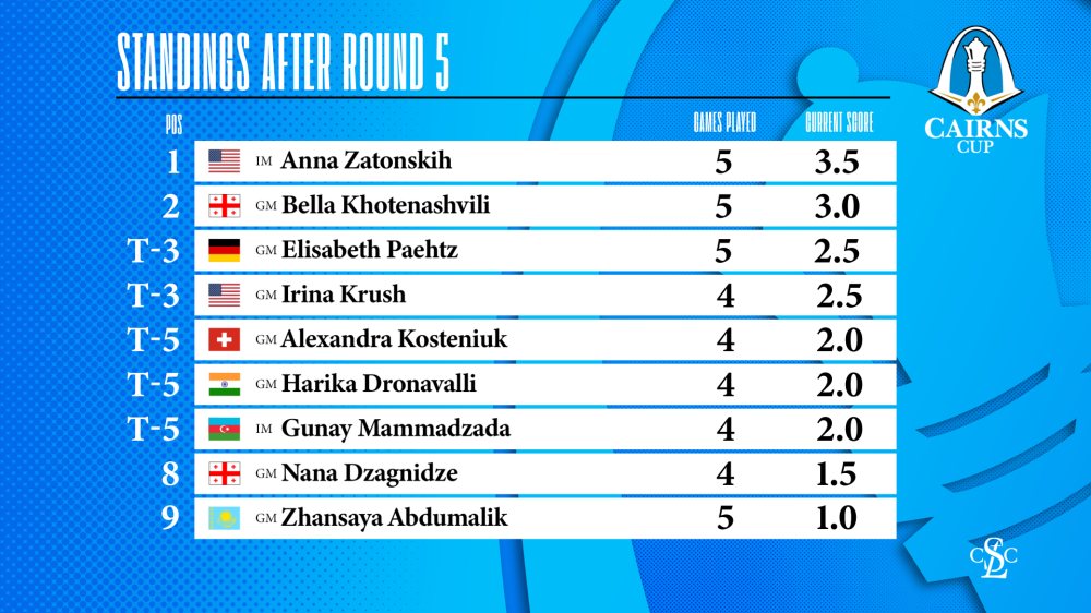 Von den vier Partien der fünften Runde wurde diesmal nur eine entschieden. Im Duell der beiden Georgierinnen zwischen Nana Dzagnidze und Bella Khotenashvili kam eine Englische Eröffnung aufs Brett mit einem doppelten Doppelfianchetto. Weiß tauschte den schwarzen Lg7 ab und trug einen schulbuchartigen Königsangriff vor. Im entscheidenden Moment fehlte jedoch die Präzision.