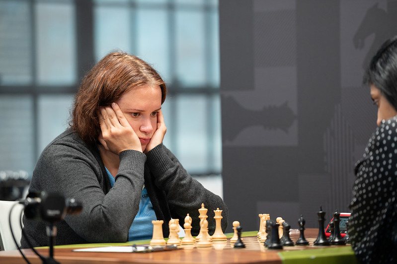 Spitzenreiterin Anna Zatonskih traf auf Harika Dronavalli und wählte im Abgelehnten Damengambit eine Abtauschvariante mit der typischen Karlsbad-Struktur. Der Minoritätsangriff kam jedoch nicht recht in Schwung und nach eher ruhigem Partieverlauf entstand ein Doppelturmendspiel, das remis endete.