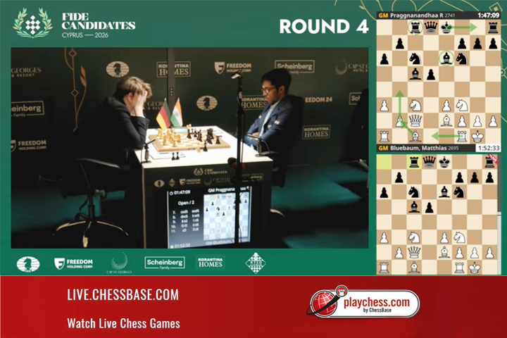 Entgegen der vorherigen Runden hatte Praggnanandhaa Rameshbabu keine frühe Eröffnungsüberraschung vorbereitet und ging eher in eine Theoriediskussion. Etwas später stieß Blübaum dann mit dem f-Bauern vor, um den Läufer auf e5 zu installieren. Zuvor hatte der Inder bereits auf e4 seinen Springer auf einem Idealfeld postiert. Im Gegensatz zu dem Springer konnte der Läufer aber mit dem f-Bauern wieder vertrieben werden. Die Stellung bewegte sich im ausgeglichenen Bereich und es sollte um die Frage gehen, ob das weiße Läuferpaar vorteilhaft eingesetzt werden kann oder nicht.
