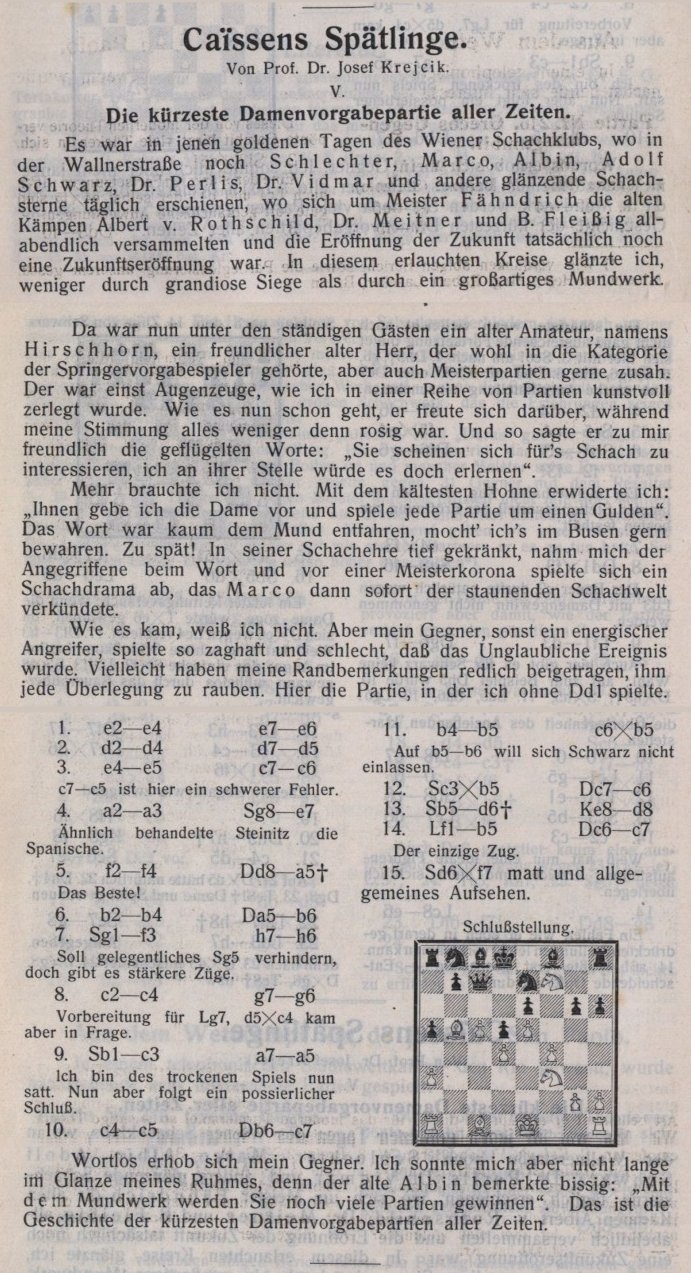 1) Der Beitrag erschien 1925 in Josef Kreijciks Büchlein: Artige und unartige Kinder der Schachmuse, Nachdruck 1987 von Arno Nickel in der Edition Marco. Die Glosse ist hier in der Original Orthografie wiedergegeben. Einige offensichtliche Druckfehler wurden korrigiert.