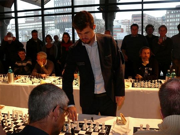 Im Simultan gegen die erwachsenen Schachfreunde stieß Carlsen besonders am Brett von Erik Fossan auf Gegenwehr. Fossan ist hauptberuflich Kapitalverwalter bei Statoil, war aber Dritter der Landesmeisterschaften 2014 und Nationaler Blitzmeister Norwegens 2011.