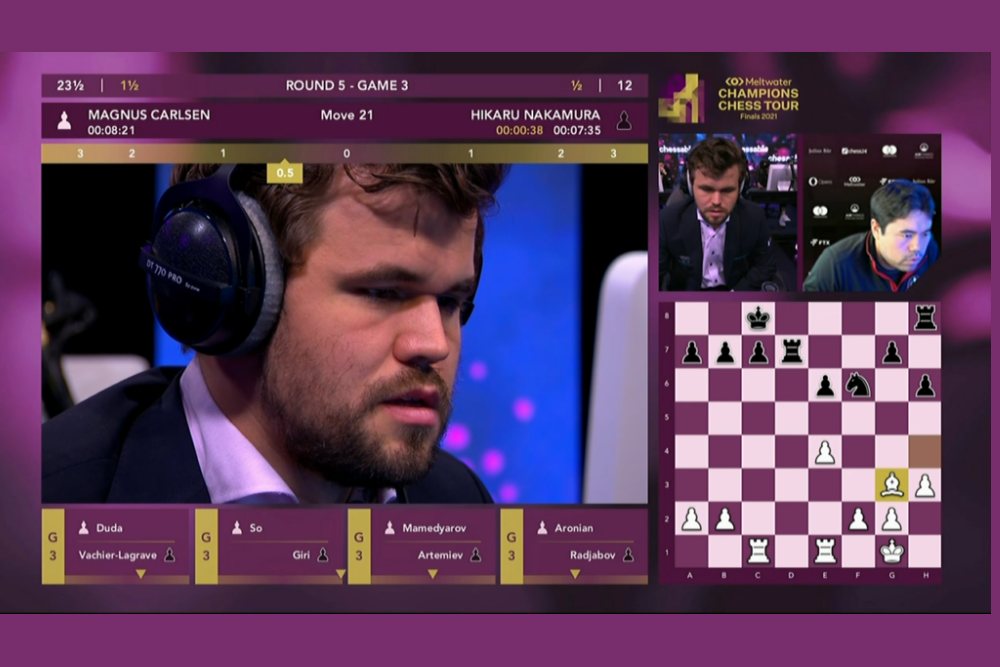 Für den Spitzenreiter der Gesamtwertung des Meltwater Champions Chess Finales verlief das Turnier bisher nicht ganz nach Wunsch, Zweimal musste Carlsen in die Verlängerung, gewann dann aber, in Runden vier verlor er jedoch sein Match gegen Vladislav Artemiev. In der 5. Runde war nun Hikaru Nakamura der Gegner von Magnus Carlsen. Diesmal verlief das Minimatch für Carlsen aber nach Wunsch.