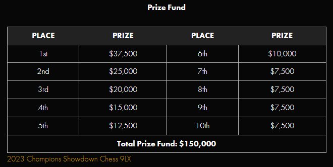 Die Zeitkontrolle beträgt zwanzig (20) Minuten pro Spieler und Partie, mit eine Zeitzugabe von fünf (5) Sekunden ab dem ersten Zug (G/20+5). Das Gesamtpreisgeld beträgt $150.000 (Einhundertfünfzigtausend US-Dollar). Im Falle eines Gleichstandes um den ersten Platz gibt es ein Stechen, um die endgültige Platzierung unter allen gleichplatzierten Spielern zu ermitteln.