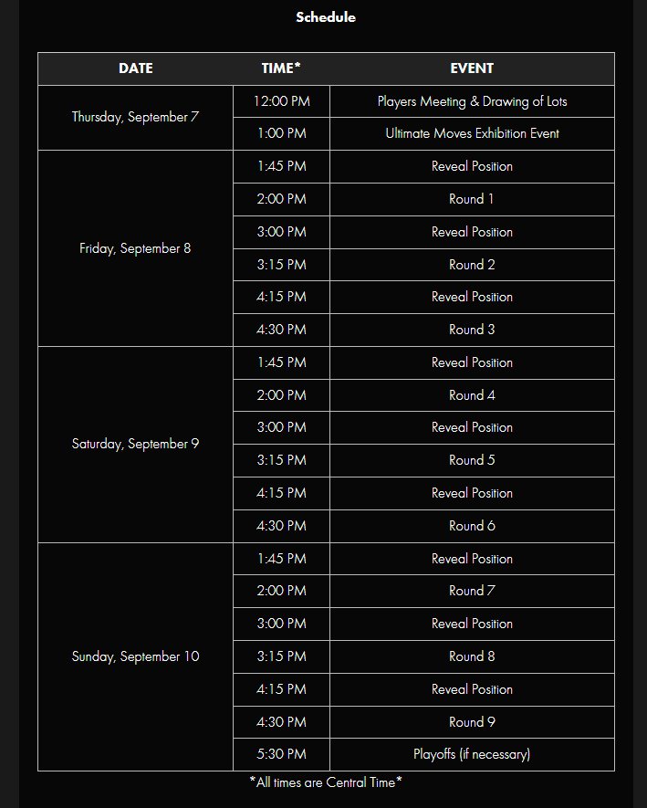 Die Veranstaltung beginnt schon am Donnerstag, dem 7. September, mit den "Ultimate Moves", einem Show-Event, bei dem auch der Mitbegründer und Sponsor des Saint Louis Chess Clubs, Rex Sinquefield zusammen mit Garry Kasparov und den anderen Spielern des Champions Showdown Turniers beim Chess 9LX antritt. Bei diesem Schachspaß bilden die Teilnehmer zwei Teams und ziehen dann an einem Brett abwechselnd.