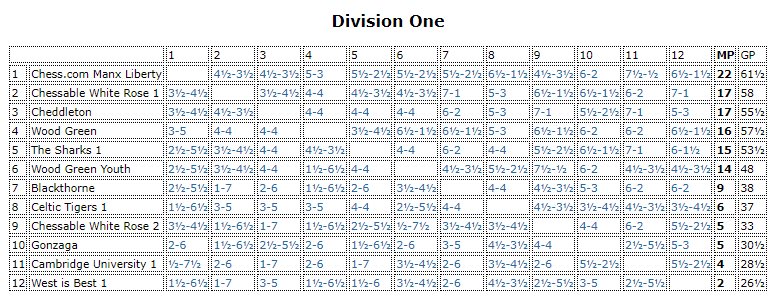 Obwohl die Saison mit einer sauberen Mannschaftsbilanz von 22-0 und einem Vorsprung von fünf Mannschaftspunkten vor Chessable White Rose 1, war der Wettkampf fast bis zum Schluss eng. Das Glück stand dem Team von Manx in dieser Saison mehrfach zur Seite, sonst hätten mehrere Mannschaftspunkte verloren gehen können.