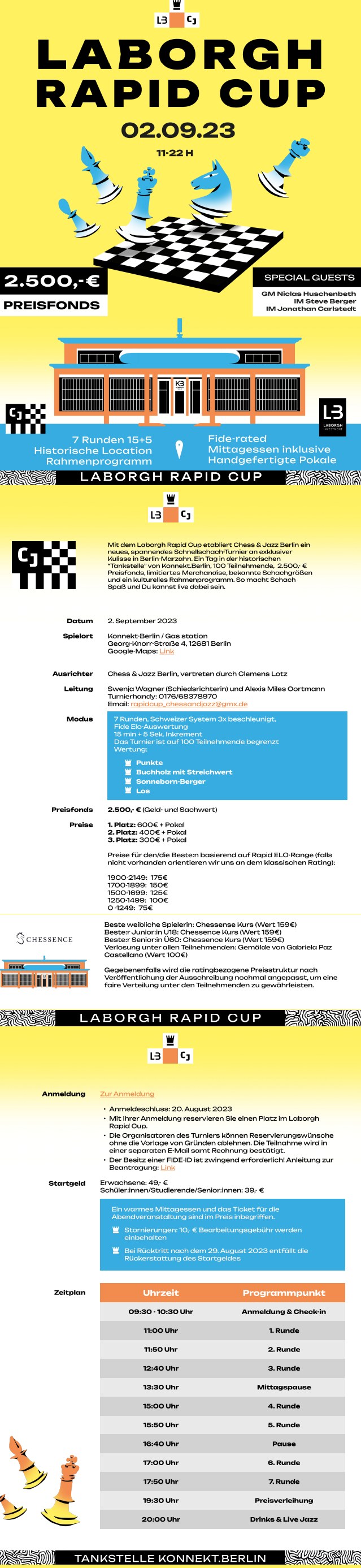 26.07.2023 – Chess&Jazz, eine Initiative des Berliner Musikers Clemens Lotz, organisiert am 2. September den "Laborgh Rapid Cup", ein Schnellschachturnier (15+5) mit einem Preisfonds von 2500,- Euro. Als Gäste werden u.a. GM Niclas Huschenbeth, IM Steve Berger und IM Jonathan Carlstedt erwartet. Austragungsort ist die Gas-Station in der Georg-Knorr-Straße 4 in Berlin