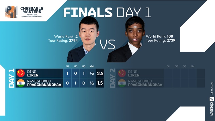 26.05.2022 – Das erste Finalmatch des 15+10-Onlineturniers "Chessable Masters" ist am Mittwoch mit einem 2,5:1,5-Sieg von Ding Liren gegen Praggnanandhaa geendet. Für den 16-jährigen Pragg sind es anstrengende Tage: Das indische Schachwunderkind pendelt zwischen den Turnierpartien und schulischen Prüfungen. Ein zweites Match wird am Donnerstag gespielt (18 Uhr); dem Weltranglisten-Zweiten Ding reicht dann ein Unentschieden, um das Turnier zu gewinnen. | Grafik: Play Magnus Group