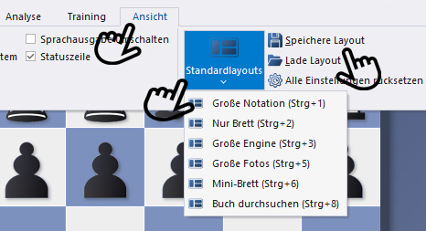 Sie können diese Ansicht noch weiter verändern: Möchten Sie zum Beispiel das Brett kleiner sehen und die beiden Fenster rechts größer, können Sie die Rahmen mit gedrückter linker Maustaste im Übergang der Fenster beliebig vergrößern oder verkleinern, wie das zum Beispiel im Windows Explorer auch möglich ist.