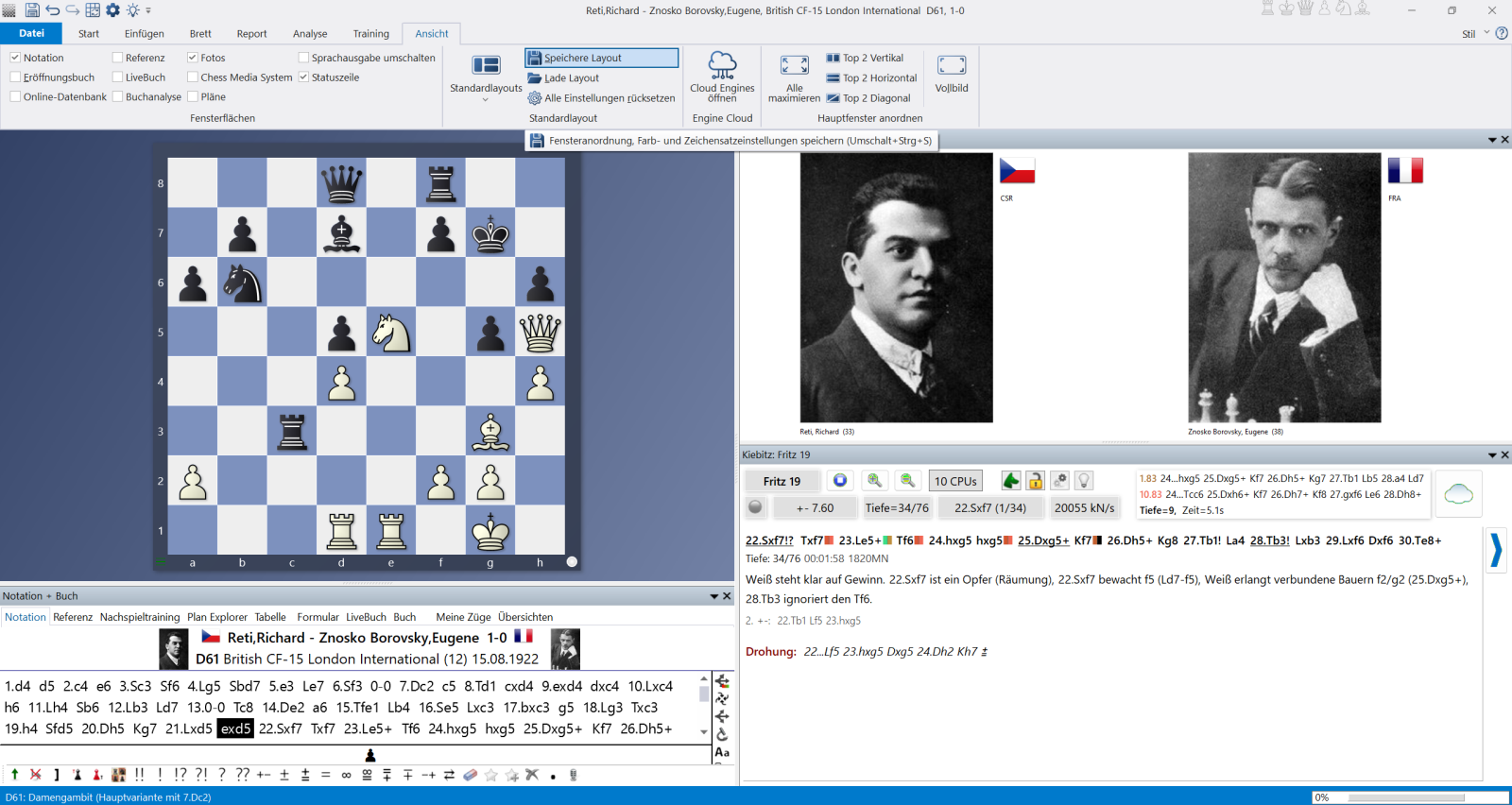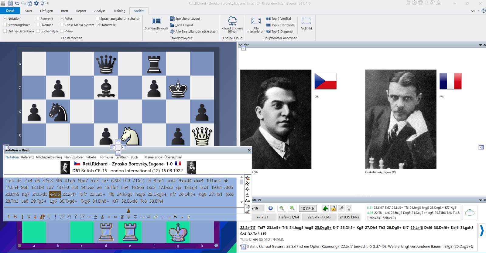 Hier wurde ein dreispaltiges Layout gewählt. Links ist das Fenster „Buch“ zu sehen, um die Eröffnungszüge genau zu betrachten. In der Mitte ist das Brett angeordnet. Rechts die Notation mit der oben beschriebenen Layoutoption „Große Fotos“.