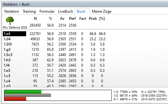 Nach der Installation können Sie Powerbook und Powerbase in ChessBase und in Fritz als „Buch“ – einer der Reiter im Notationsfenster – aufrufen. Hier das Beispiel aus der Fritz-Maske, das in ChessBase identisch aussieht: