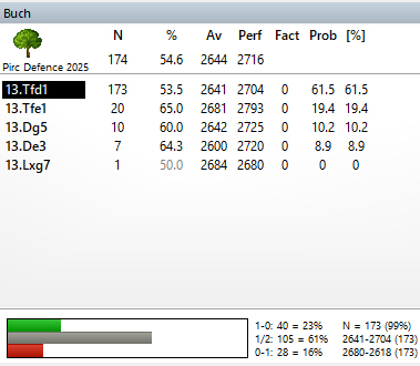 Hier sehen wir noch fünf verbliebene 13. Züge von Weiß. Sowohl der Partieanzahl (N) als auch den Elo-Werten (Av und Perf) können wir entnehmen, dass es sich bei 13.Tfd1 um eine häufig gespielte Variante handelt.