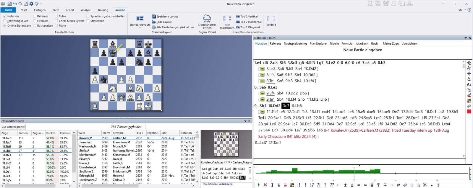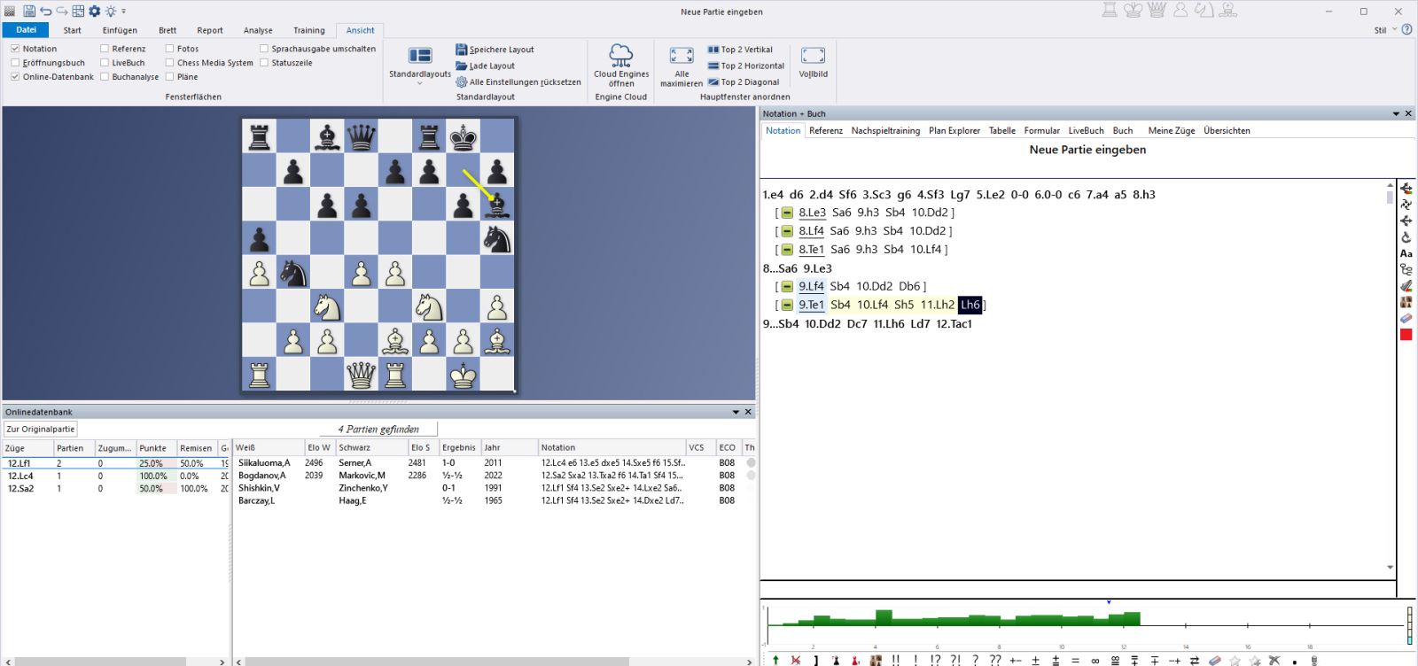 Hier sind bereits Varianten eingefügt, indem einfach in der Notation zurückgegangen wurde und andere als die häufigsten Züge ausgewählt wurden. So kann man sich seine eigene Eröffnungsdatei aufbauen. Holt man sich dann noch – wie hier unter dem Brett geschehen – die Online- oder die Mega-Datenbank hinzu, findet man auch passendes Partiematerial. Dieses lässt sich natürlich auch in die Notation einfügen (Rechtsklick auf die gewünschte Partie und „Kopiere in Notation ...“ wählen):