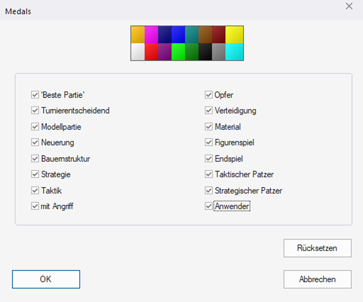 Ein besonders nützliches Feature ist die Filterfunktion mit Medaillen. In der Suchmaske (siehe Tutorial 19) gibt es einen eigenen Reiter für Medaillen, unter denen man gezielt nach Partien mit bestimmten Auszeichnungen suchen kann. Dabei kann man auch mehrere Medaillen gleichzeitig auswählen – ChessBase 18 zeigt dann nur die Partien an, die alle gewählten Kriterien erfüllen. So lassen sich beispielsweise taktisch besonders interessante Partien schnell finden, oder man filtert nach Spielen mit strategischen Wendepunkten. Die Medaillenfarben werden auch im Filtermenü angezeigt, sodass die Auswahl intuitiv und visuell unterstützt wird.