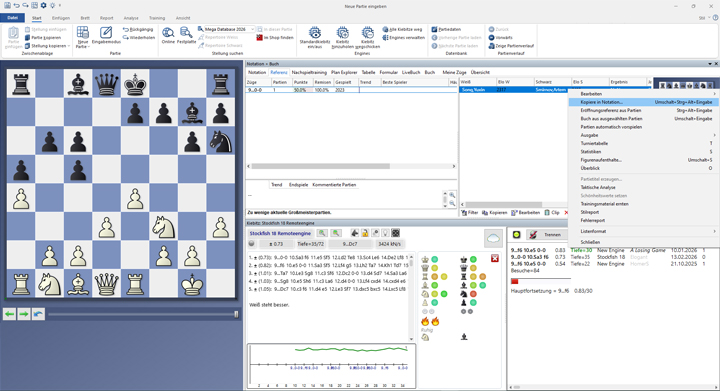 Wenn Sie mit der rechten Maustaste im rechten Fenster auf die Partie klicken, öffnet sich das obige Menüfenster. Hier können Sie auf „Kopiere in Notation...“ klicken. Im Beispiel handelt es sich um die einzige Partie, die die links abgebildete Stellung erreicht hat.